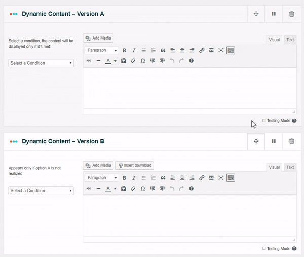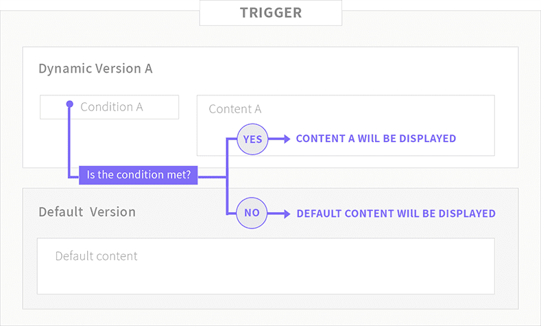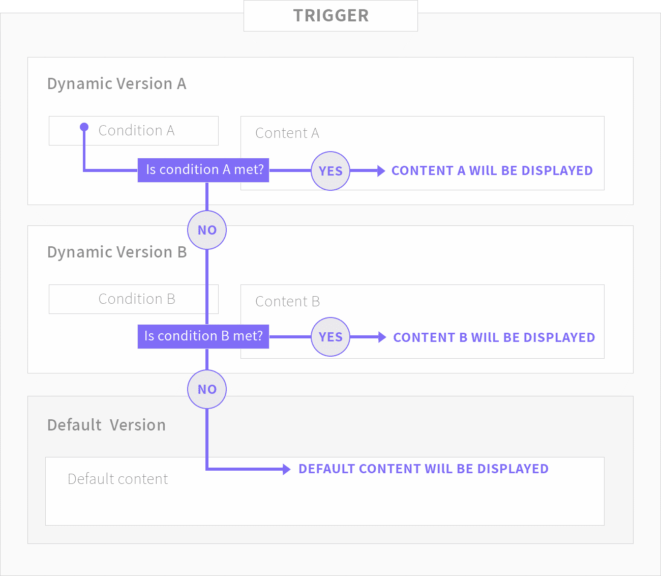 If you choose to create a trigger with more than one version, the condition of the first version (Version A) will be checked first. If the condition is met, Version A will be displayed. If the condition is not met, the condition of Version B will be checked, and so on. If none of the conditions are met, the default version will be displayed.